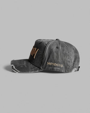 The Kingdom Distressed Cap features a hand-distressed finish and a bold 3D-raised Kingdom design embroidered on the front. The side displays Matthew 11:12 in flat embroidery. An adjustable metal strap at the back providing a secure and comfortable fit, while the exterior showcases a unique abstract Kingdom pattern, ensuring that every cap has a distinct signature touch.