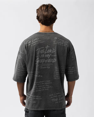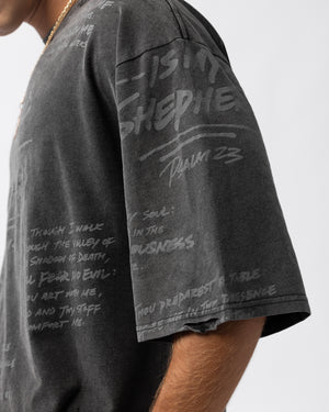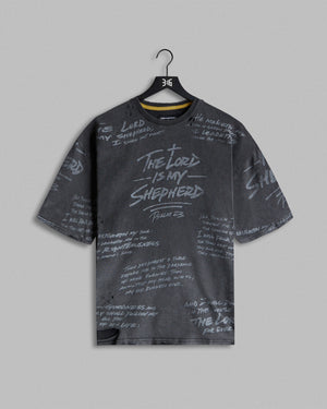 But what truly sets this tee apart is its captivating design - the entirety of Psalm 23 delicately printed across the fabric, a testament to grace and tranquility. Let the soothing words of this timeless psalm envelop you as you go about your day, a reminder of strength and resilience.
