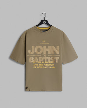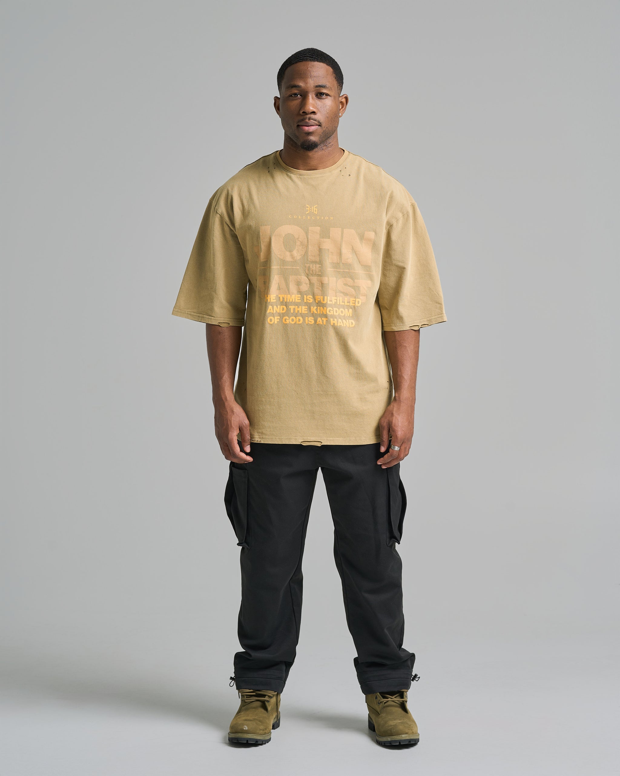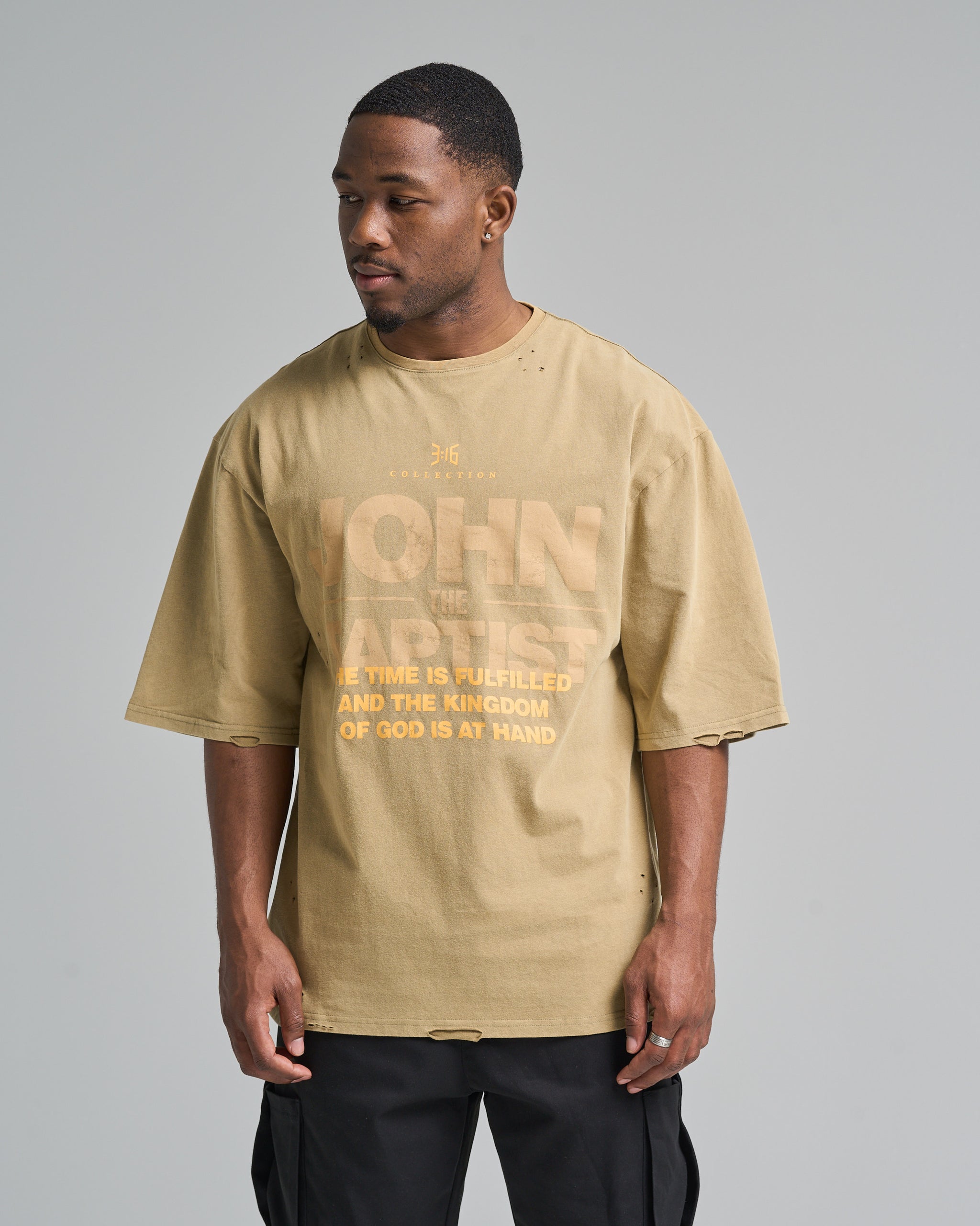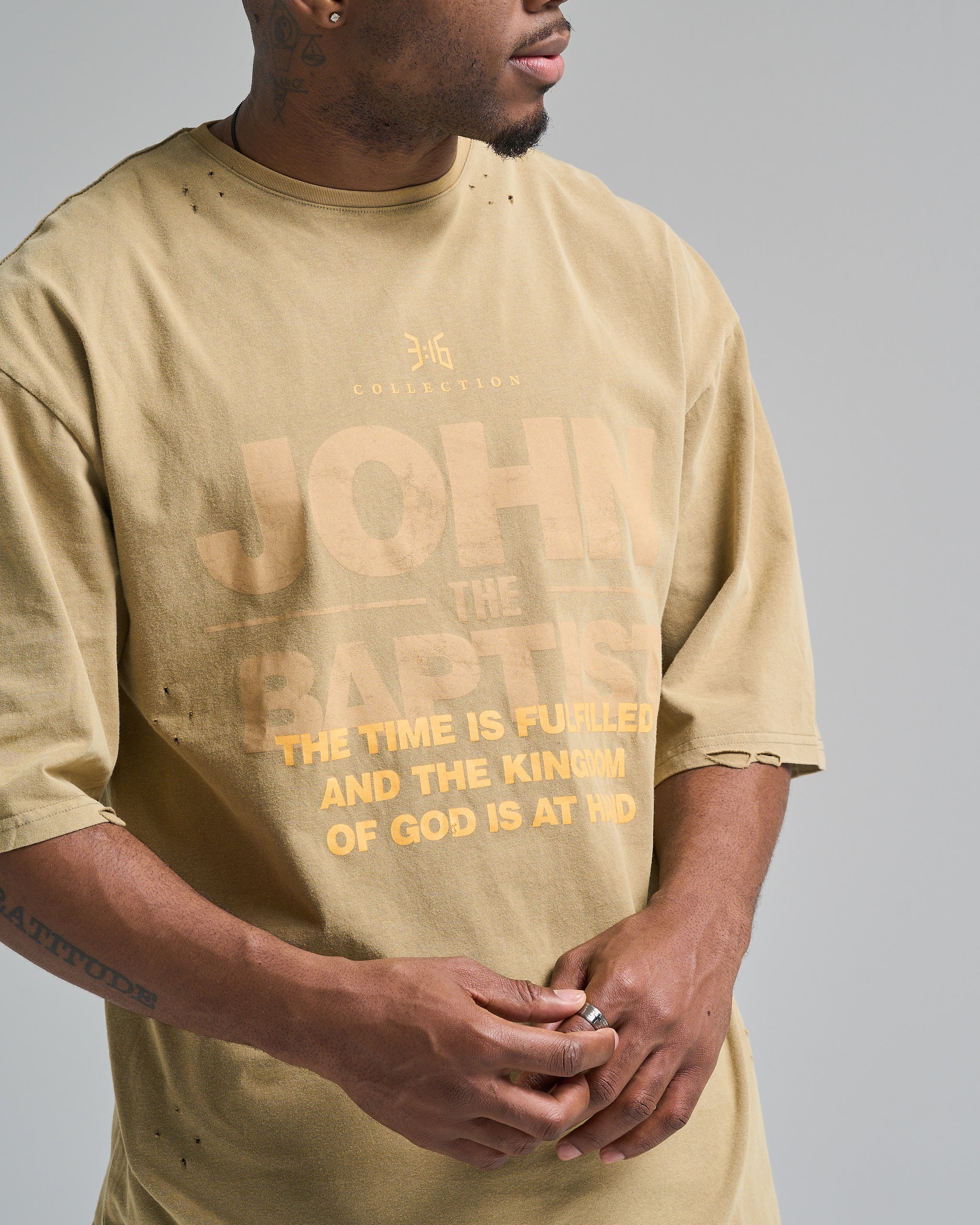 Crafted from premium 100% cotton jersey, the Tee combines comfort with an edgy, worn-in aesthetic. Designed with an oversized, relaxed fit, this statement piece features a bold graphic print honoring John the Baptist, the prophet who prepared the way for Christ. Intentional distressing along the hem, body, and neckline adds depth and texture, giving the tee a vintage-inspired, lived-in feel that resonates with the raw essence of his story.